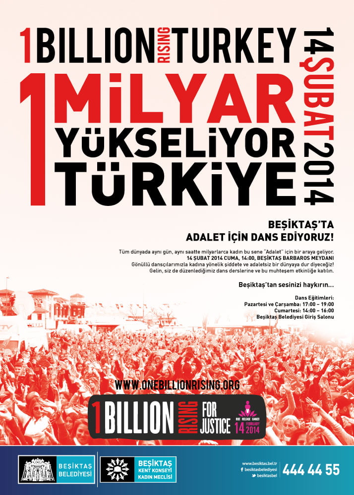 Geçen yıl 14 Şubat’ta binlerce kişinin katılımıyla Beşiktaş Belediyesi tarafından düzenlenen “One Billion Rising” (Bir Milyar Yükseliyor) etkinliği bu yıl da 14 Şubat’ta Barbaros Meydanı’nda tüm dünya ile eşzamanlı olarak gerçekleşecek.